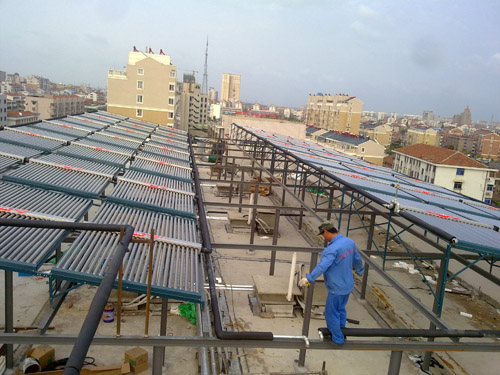 5)控制系統 全自動運行,可實現計算機智能化控制,性能可靠,使用方便,具有定溫出水、循環加熱防凍控制功能。可以和任何一種常規能源熱水系統配合,完全實現全日制24小時連續熱水供應的大型集熱式太陽能熱水系統。